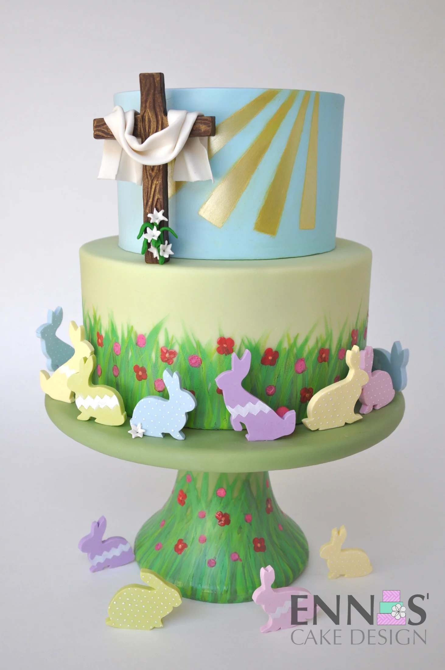 This cake was made as part of A Painted Easter collaboration, my very first collaboration. With this cake I wanted to represent the secular and spiritual sides of Easter, by making it adorable and honoring of Jesus. From the hand-painted cake stand, made to match the painting on the cake itself, to the rays of the sun shining on the cross this cake was meant to be a reminder of what Easter is all about.